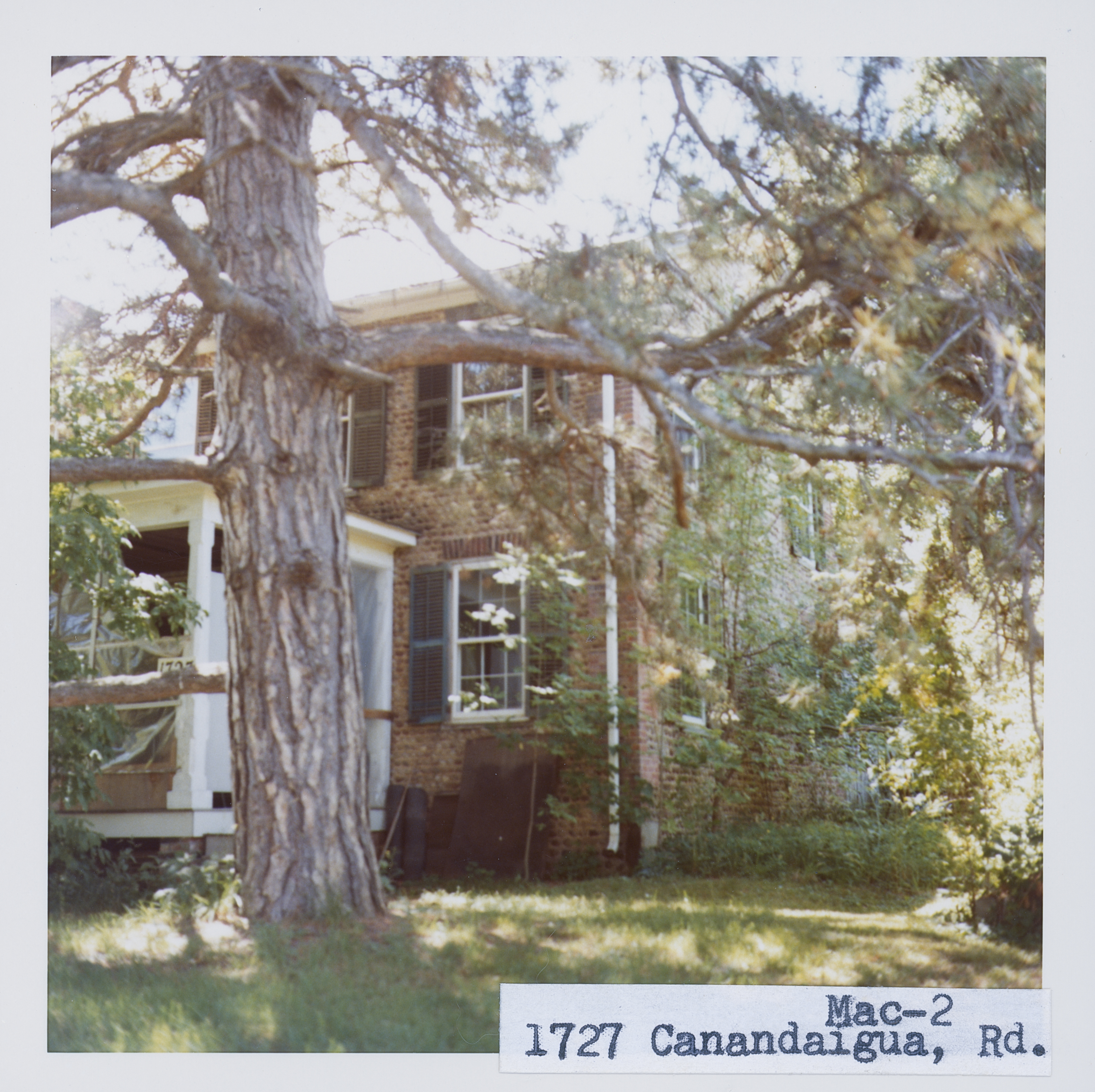 The two story cobblestone at 1727 Canandaigua Rd. has brick quoins and window lintels. Stones are irregular, rough and moderate in size. Horizontal mortar is v-shaped, and the verticals are mostly raised, with pyramids cut off at the bottom. A wooden addition has been added to the west side and a porch added in front. Roudabush Survey page 109