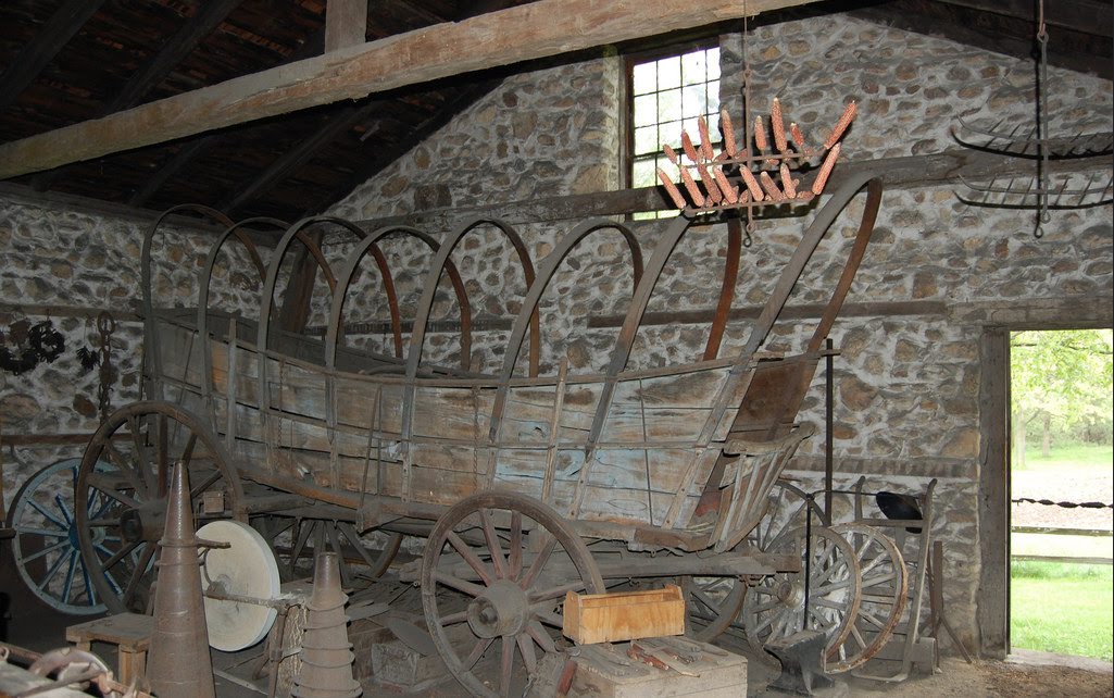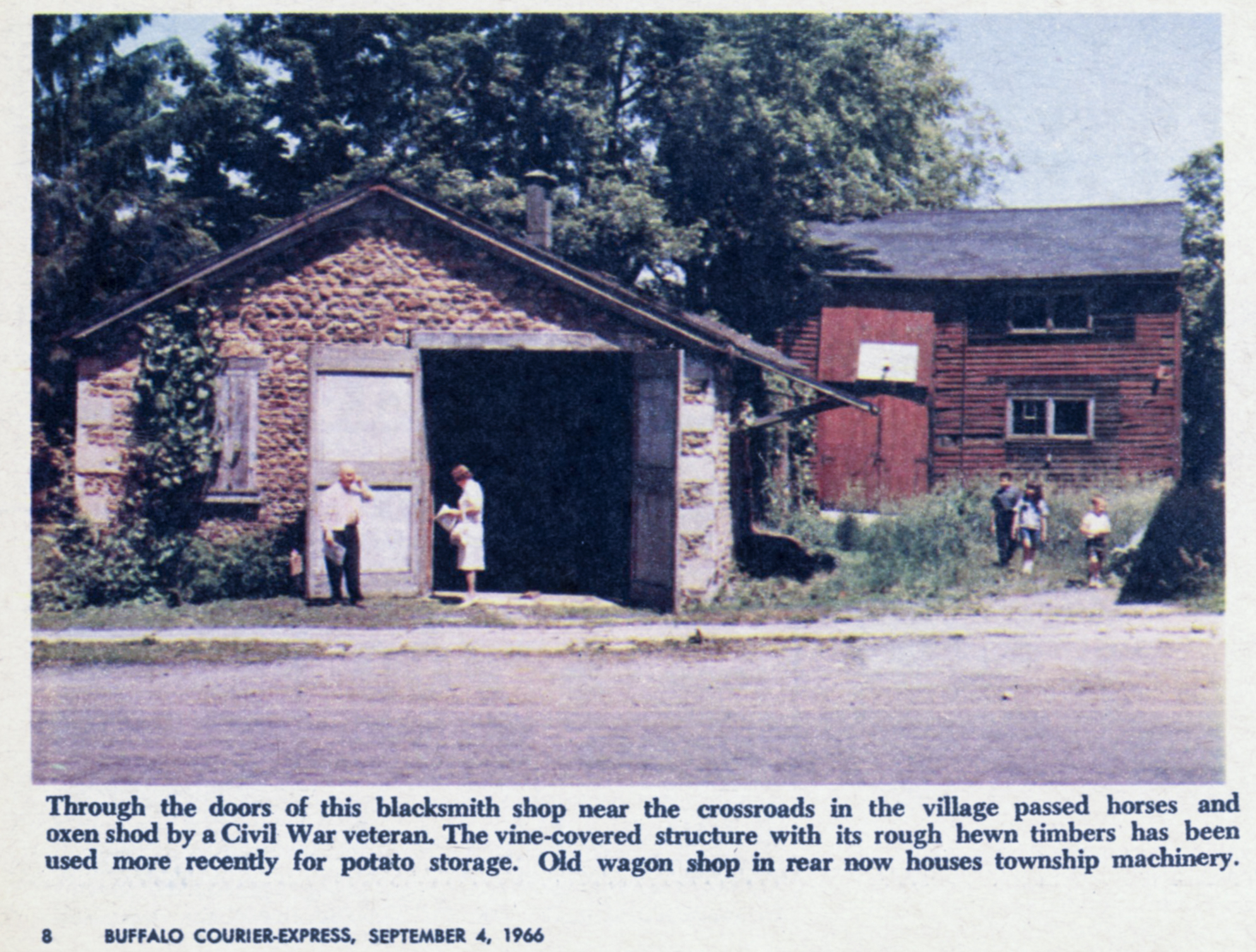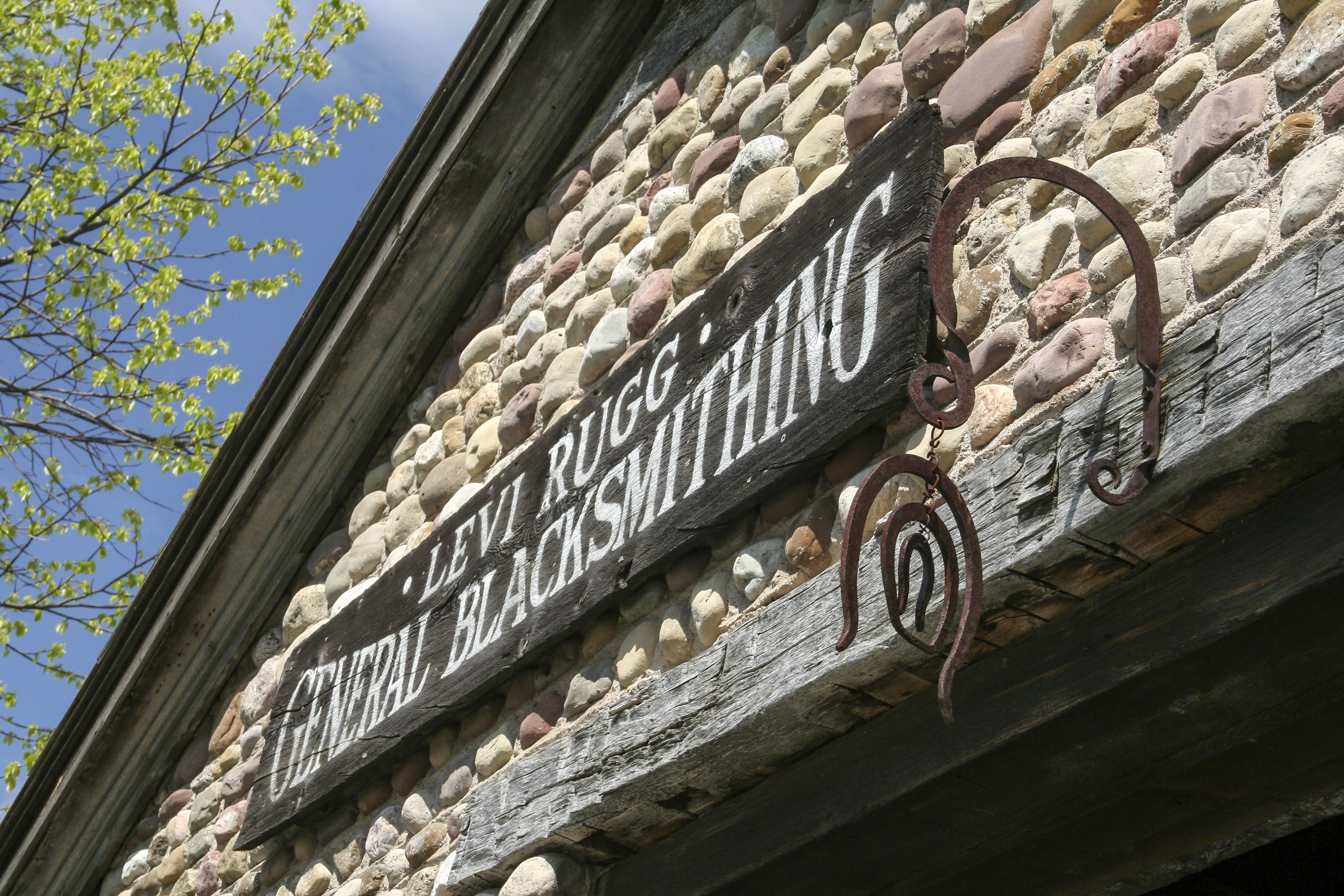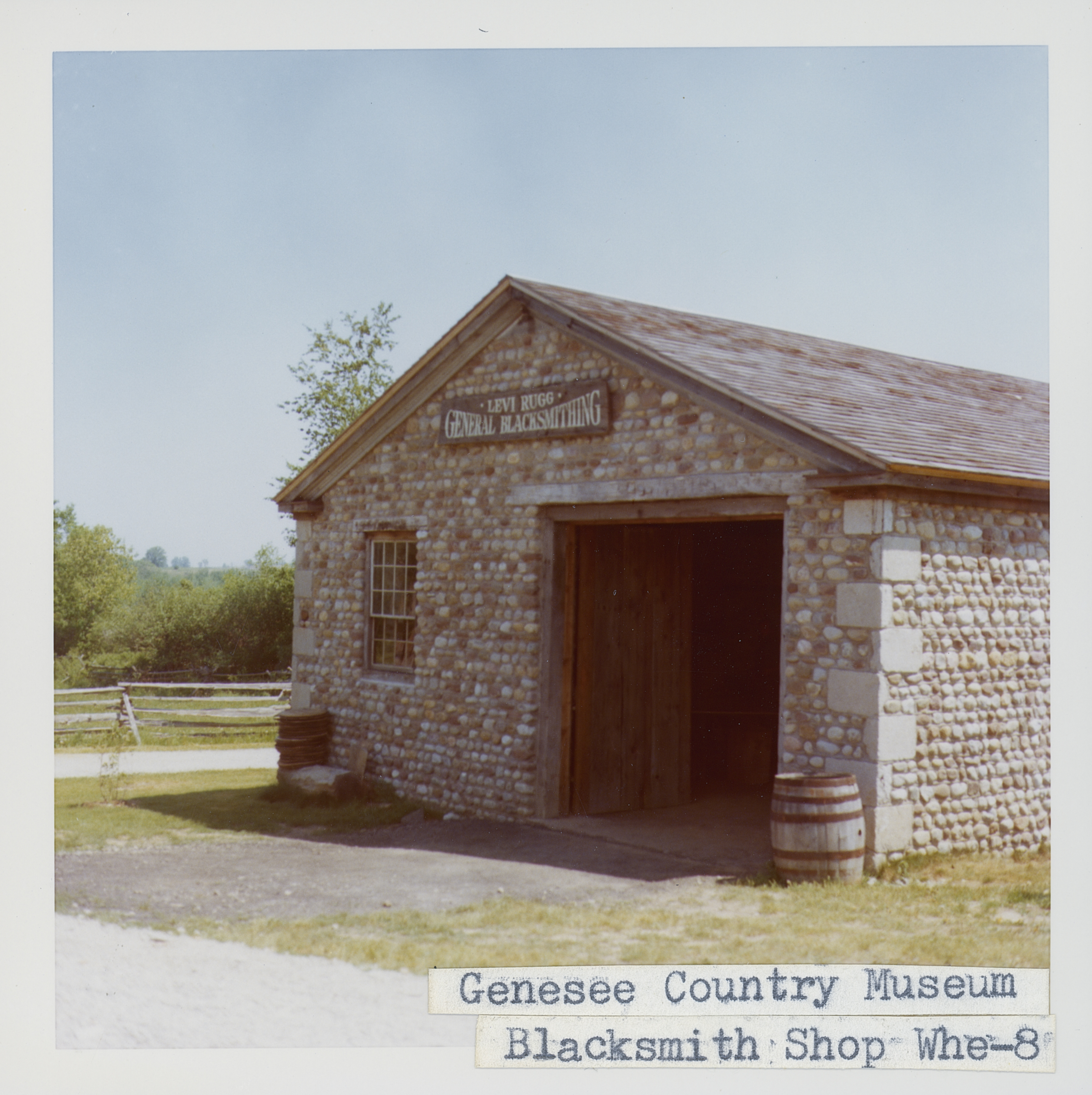 Levi Rugg, whose shop is now at Genesee Country Historic Village, was engaged in the two related occupations - smithing and wagon repair. His wagon shop was handy to the cobblestone blacksmith shop, then owned by blacksmith William Bradley Rugg's own shop was across the street from Bradley's. This congestion of competing enterprises was common in the world of the blacksmith and illustrates some of the economics of the early 19th-century village. There may not have been a blacksmith shop on every corner, but in the average village there were more blacksmith shops than cobbler shops. Rugg eventually purchased the cobblestone shop, moved his operations into it, and ran a general blacksmithing business there until his death in 1875. Two succeeding smiths worked in the shop until well into the 20th century.