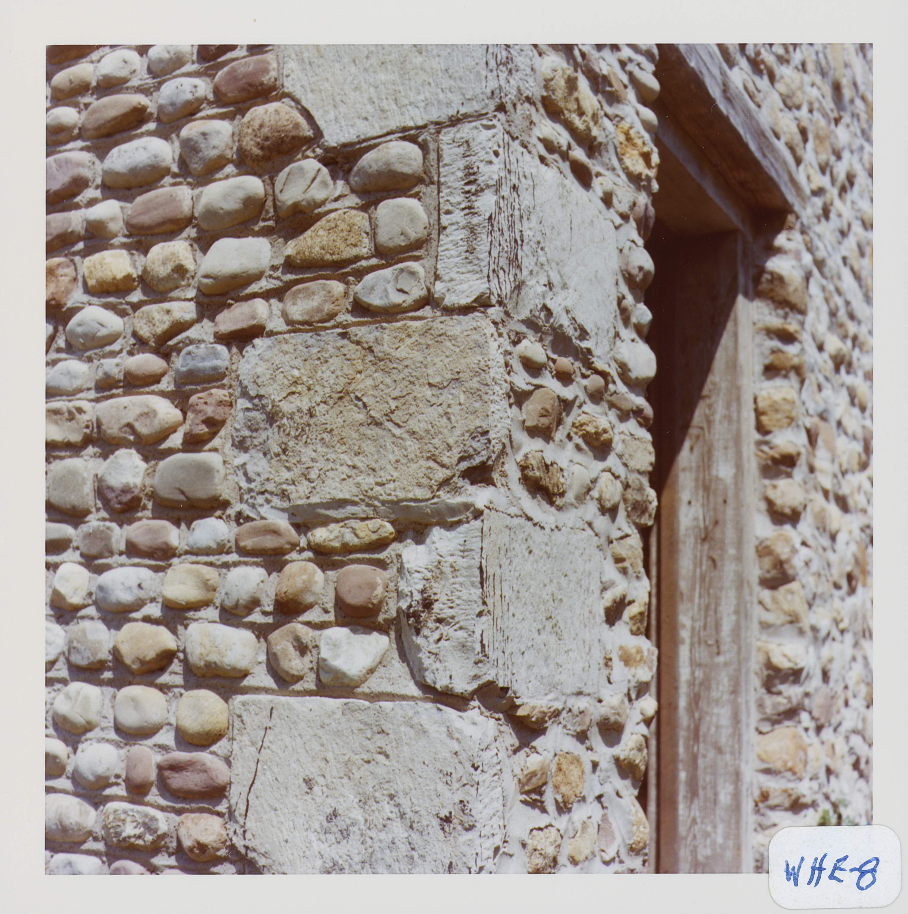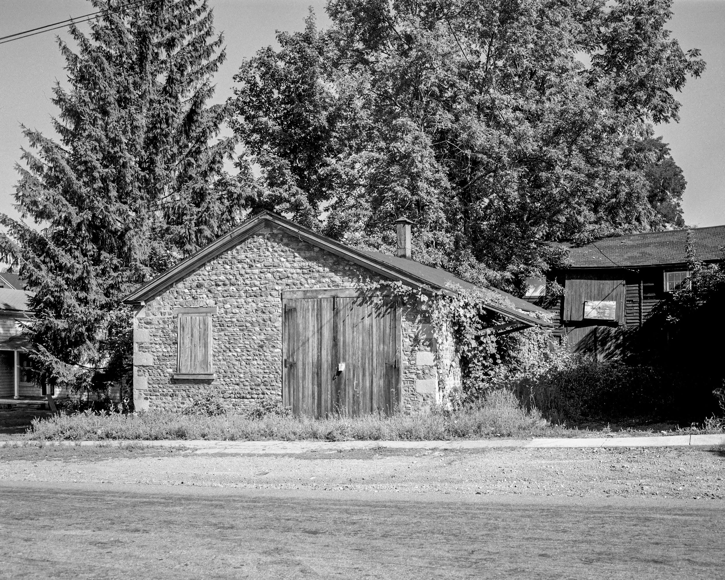 The blacksmith shop now in the Genesee Country Museum originally stood on Mechanics Street in the town of Elba in Genesee County. The quoins are fairly regular, except in thickness. Stones are variable in color and are fairly large, and are laid three rows to the quoin on the front and sides. Horizontal mortar between rows is pointed, and the vertical mortar is also pointed and is cut off from both the upper and lower horizontal. Roudabush Survey page 67.