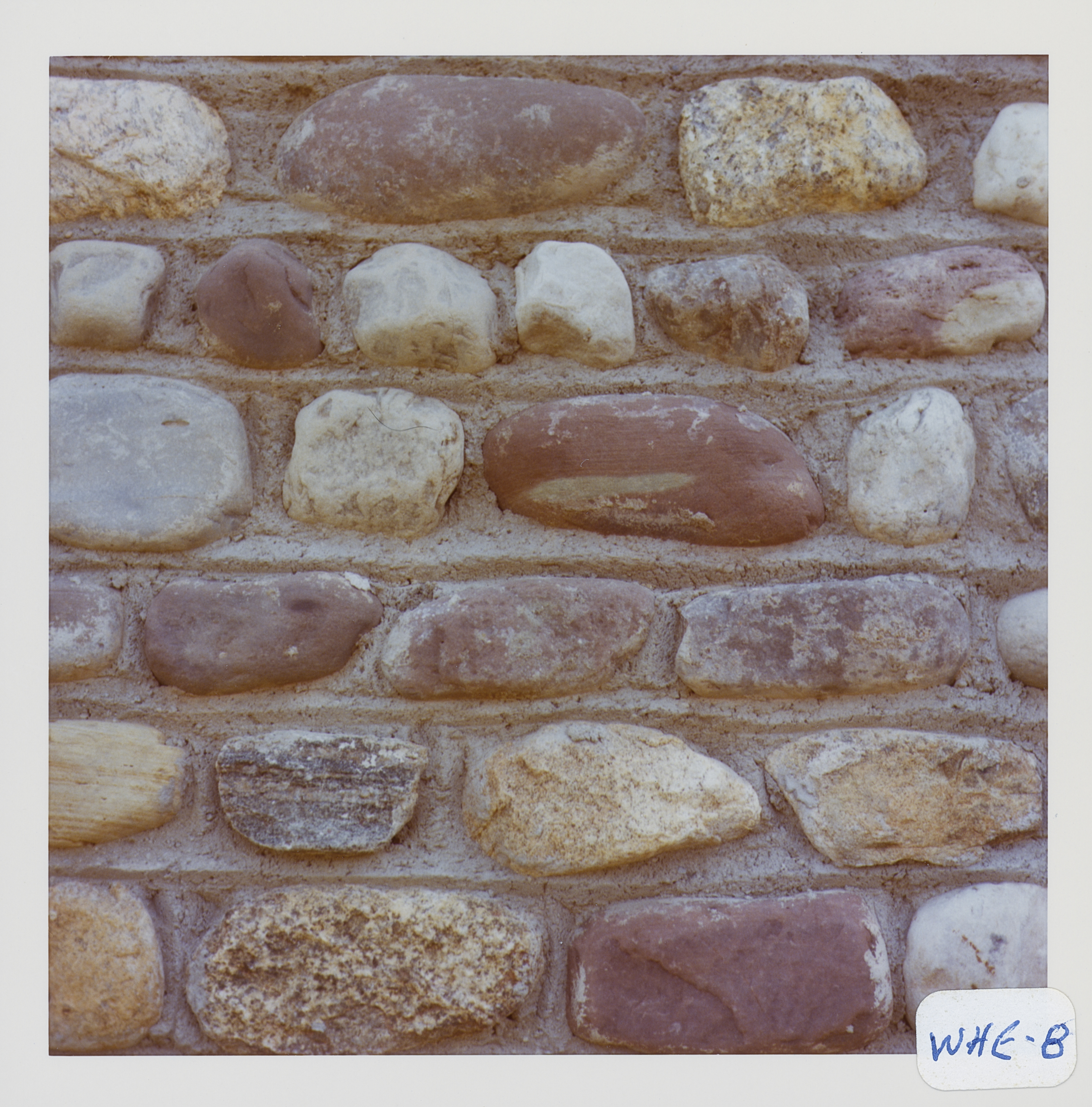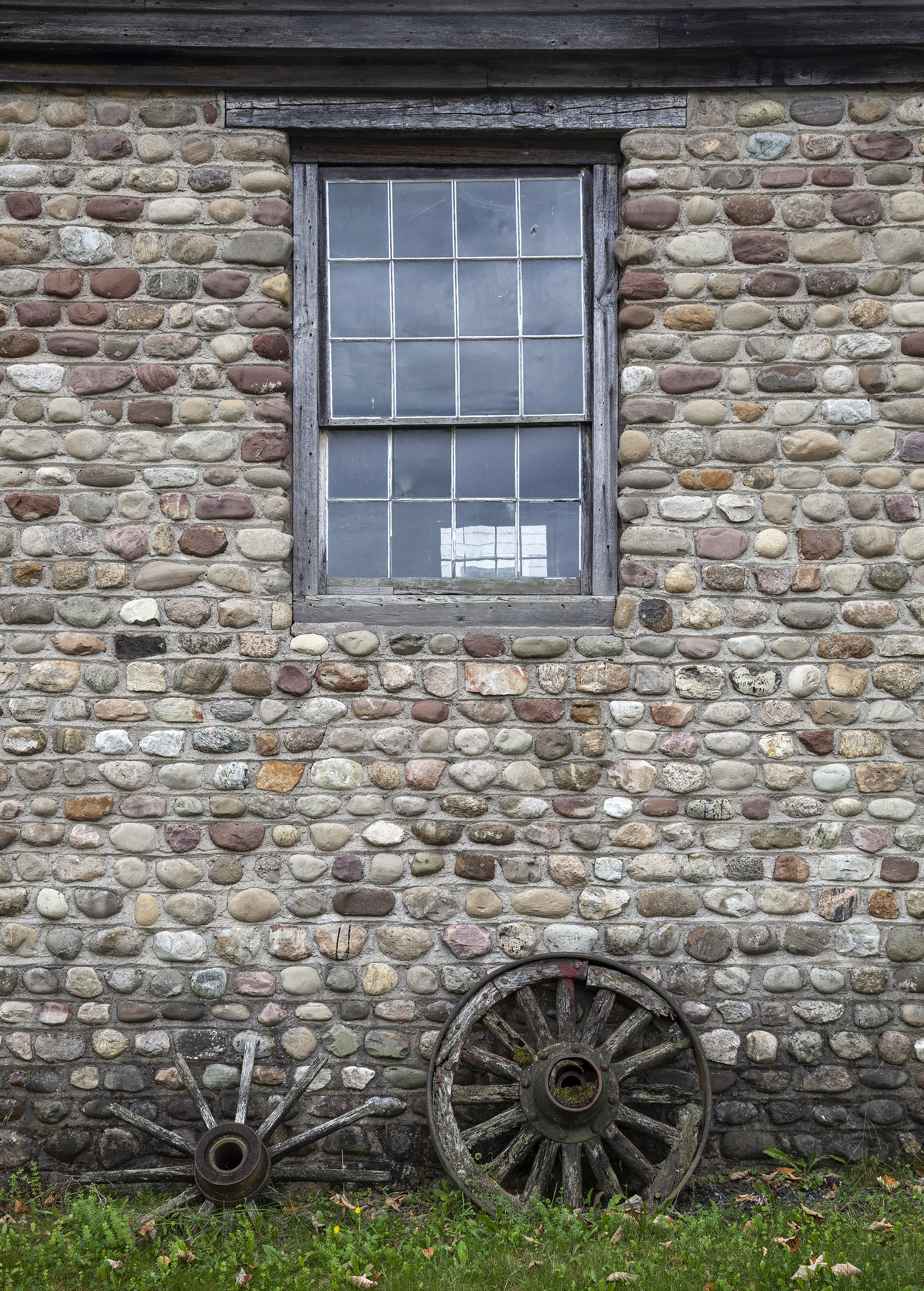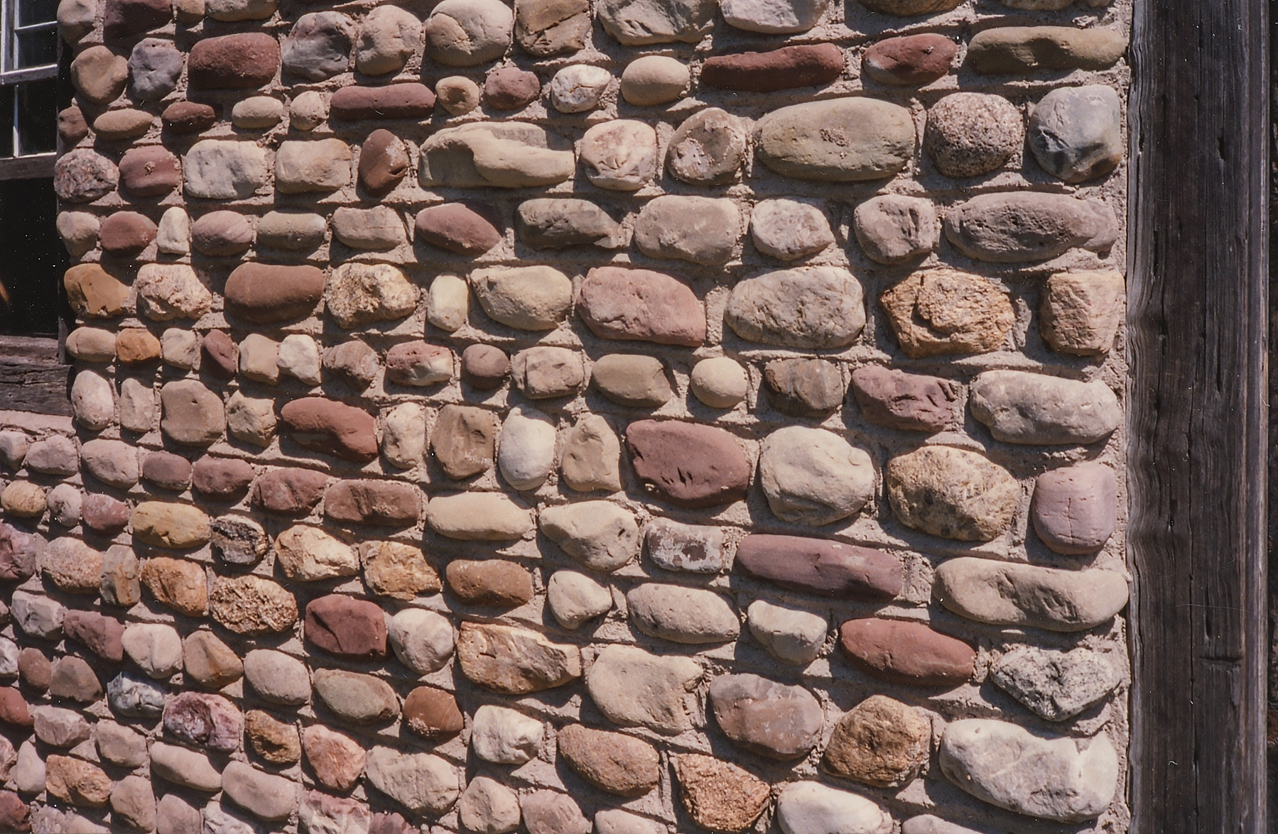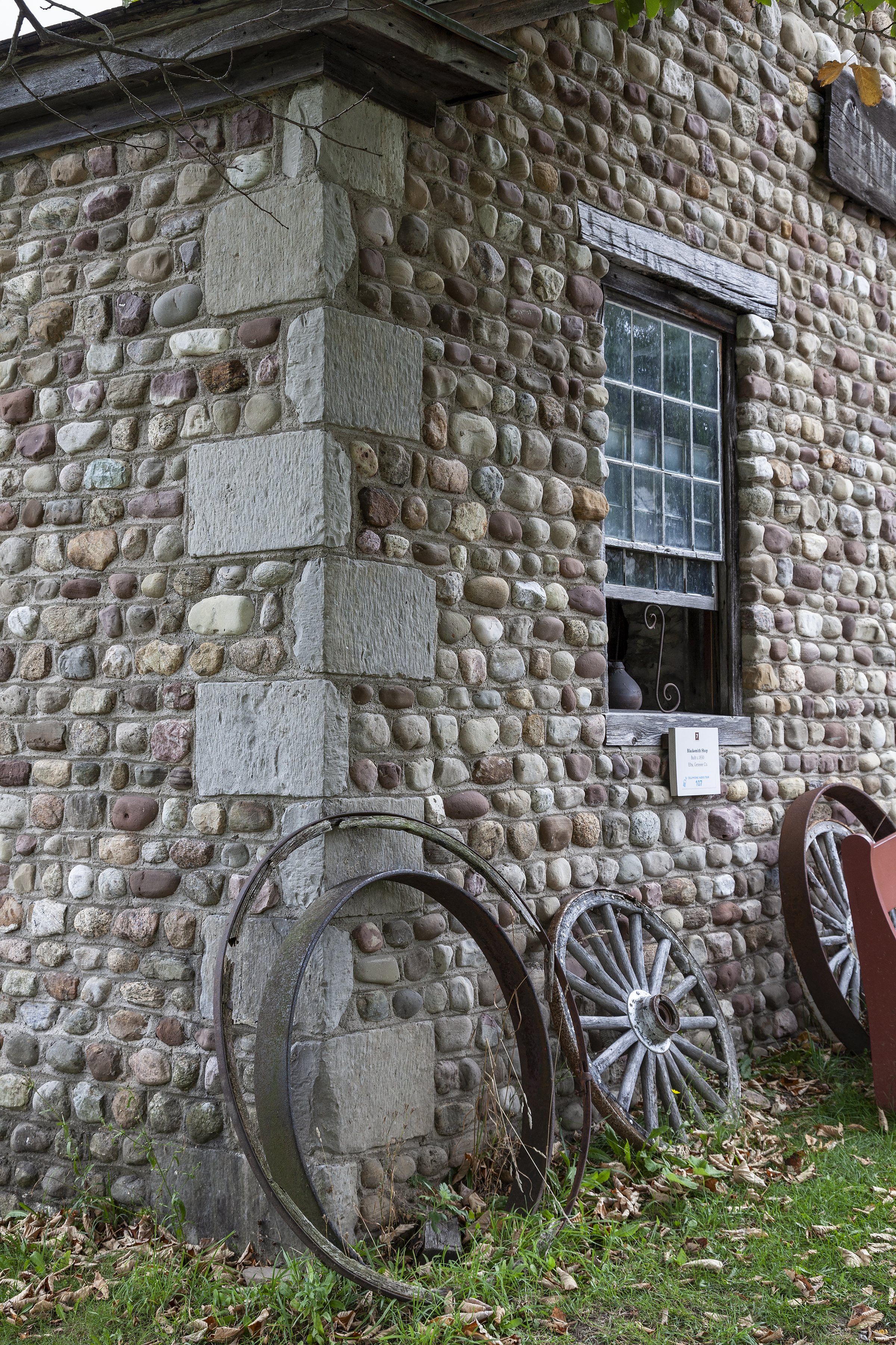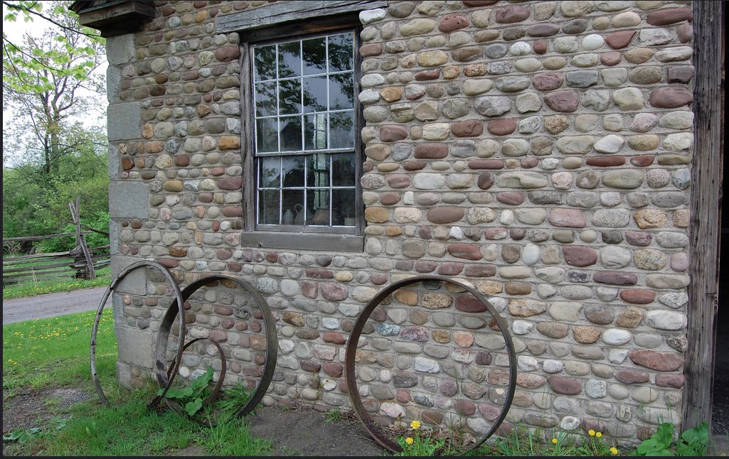 The Levi Rugg blacksmith shop was originally located on Mechanic Street in the village of Elba. It was built in 1839 and operated well into the 20th century. In 1976 it was dismantled and reconstructed at Genesee Country Village museum near Mumford, N.Y. It was reconstructed with cinder blocks and then the cobblestone facing was placed on the exterior and the interior. The original joint work was not reproduced. The original west wall cobbles were collected separately from the east, south and north walls. Each wall's cobbles were put up on their respective original faces but obviously in their original exact rows or location on each wall. The interior cobbles were just put up where convenient and are naturally un-coursed, just like a barn foundation. The core of the wall is cinder block. Richard Palmer blog.