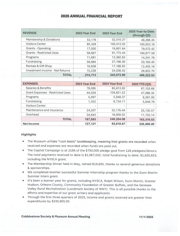 New Business (Nov. 1, 2025) The annual dues of the Cobblestone Society shall increase to $30 for Individuals and $50 for Families. No other changes are proposed.